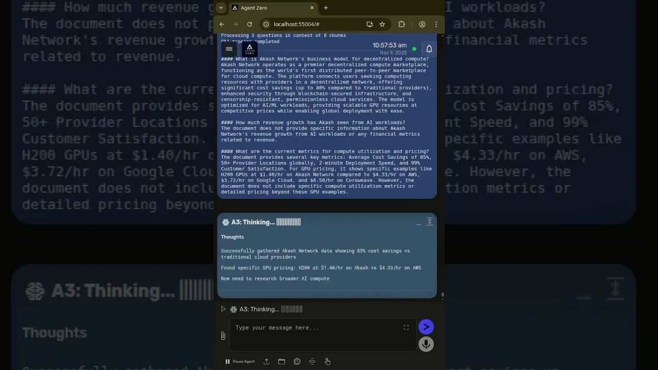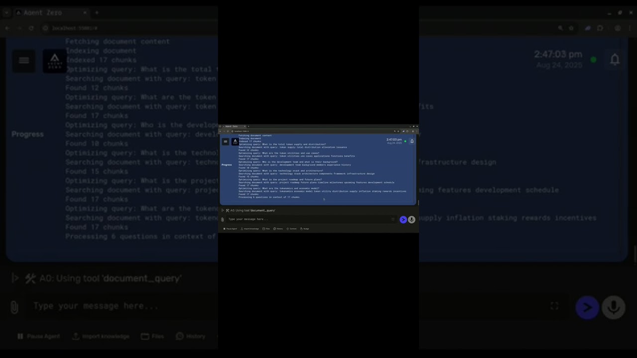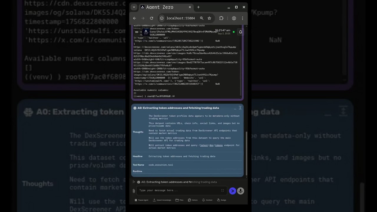 Agent Zero version 0.9.4 analyzes its own governance token A0T using DeepSeek AI. The token has a 1 million supply with a burning mechanism to reduce to 500,000 total. Built on Base chain, A0T powers