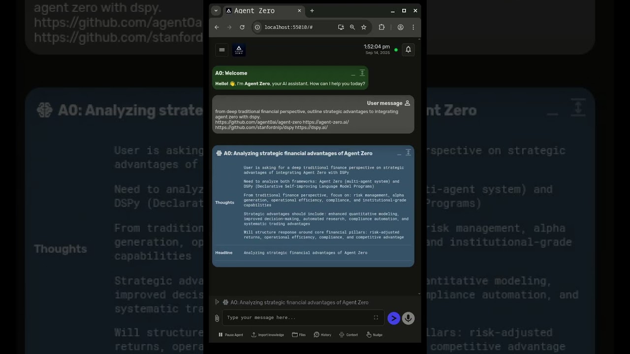 Discover how Agent Zero integrates with DSPy to create self-improving quantitative trading systems with institutional-grade financial analysis capabilities.