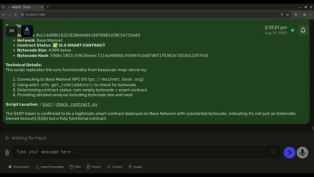 Agent Zero Automates $A0T Contract Analysis via Blockscout + CoinGecko
