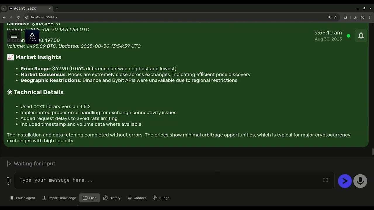 Agent Zero AI Tracks Bitcoin Prices with ccxt