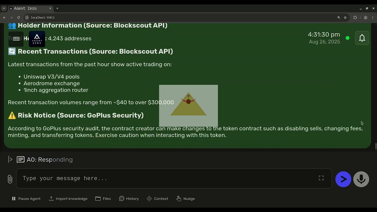 Agent Zero integrates with Blockscout and CoinGecko APIs for comprehensive $A0T token holder analytics.