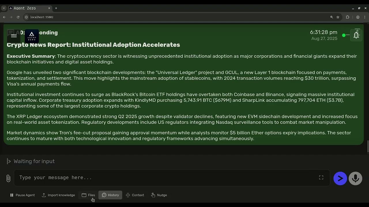 Agent Zero Delivers Real-Time AI Crypto News Report