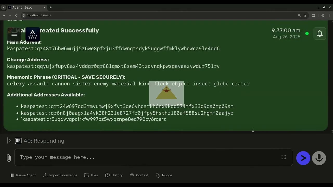 Agent Zero Generates Testnet Wallet Using Kaspa MCP Server