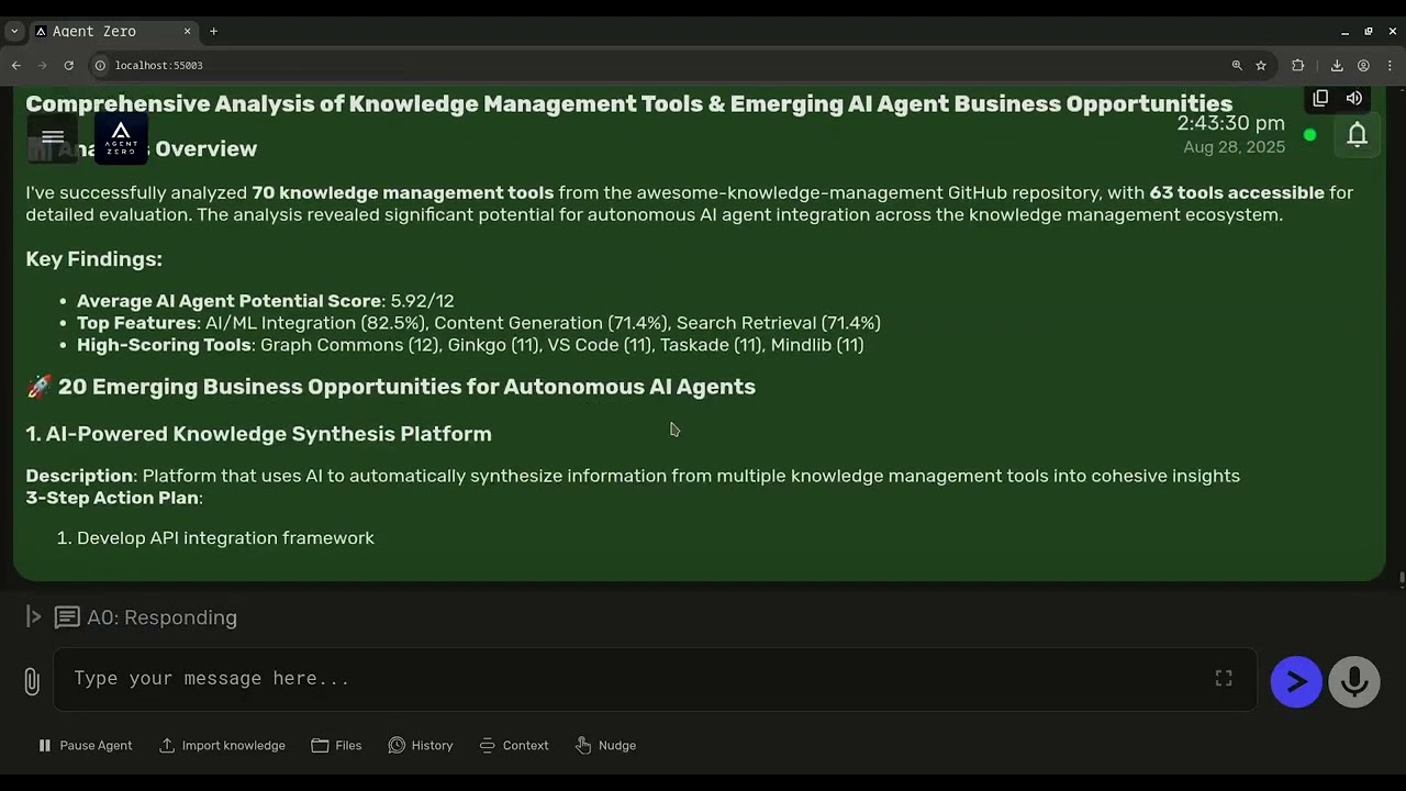 Agent Zero installs Solana Agent Kit and creates detailed analysis uncovering 60+ blockchain capabilities and 10 business opportunities.
